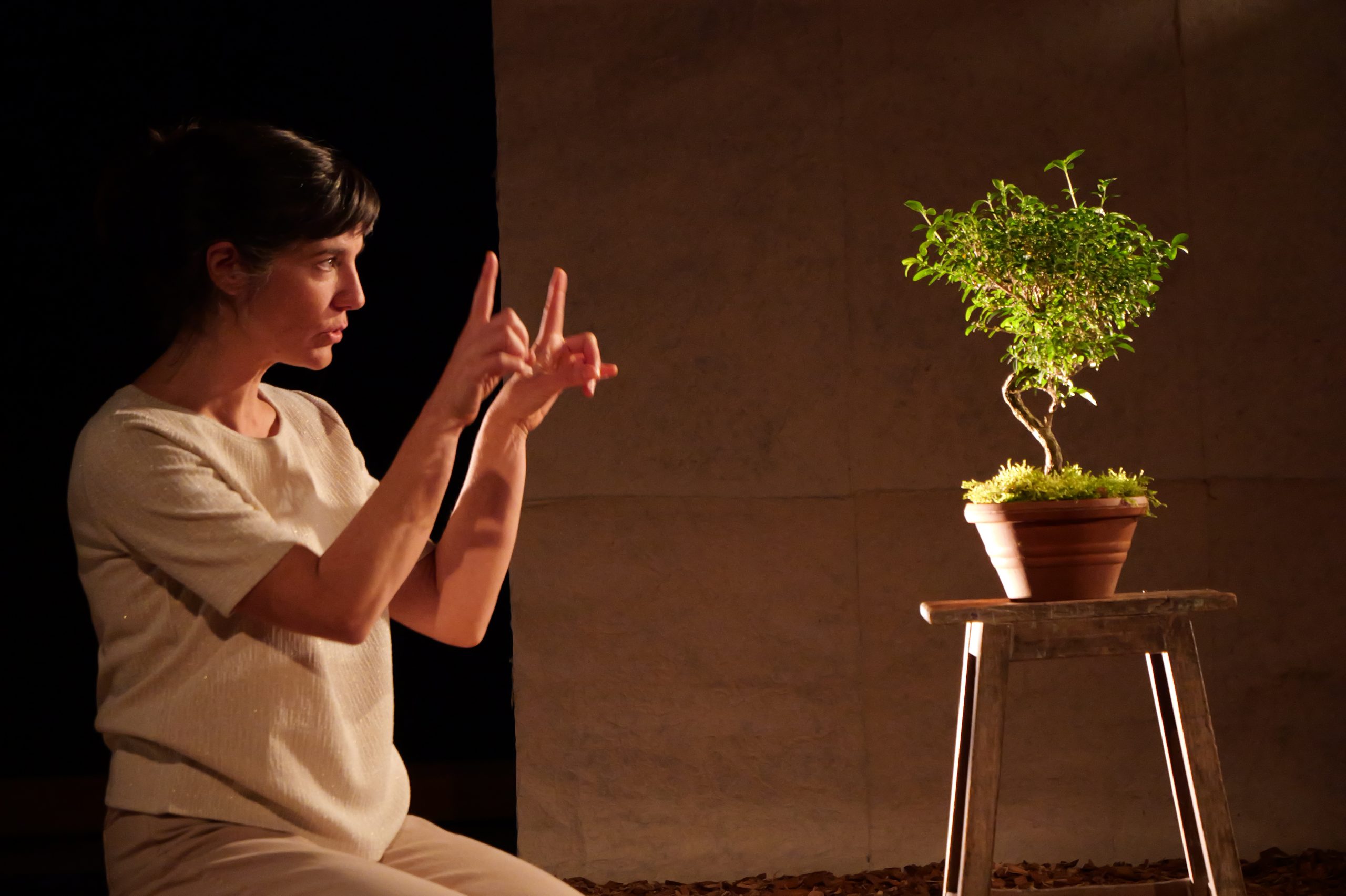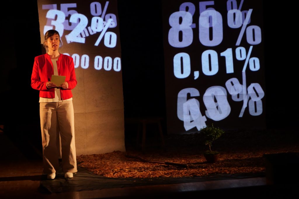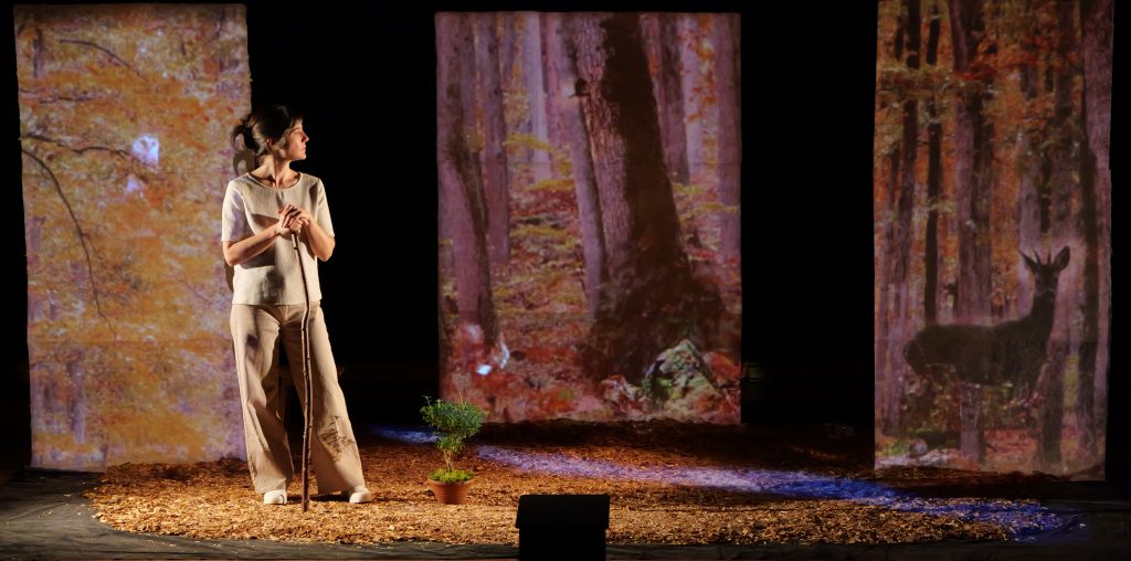 Des copeaux de bois sont au sol et des matériaux glanés dans la nature sont accessoires de jeu. La proposition scénique vise à créer au fil du récit une sorte d’écosystème.